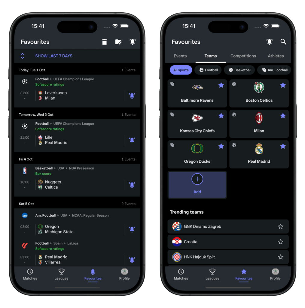 Before, the Favourites tab was just a list that showed finished and upcoming events for entities you followed. Now it has a whole new layout, with tabs that make it easy to browse and edit favourite teams, competitions, and athletes. Events are still here, but they now live in their own tab where you can adjust your notification settings and clear past events with a tap.