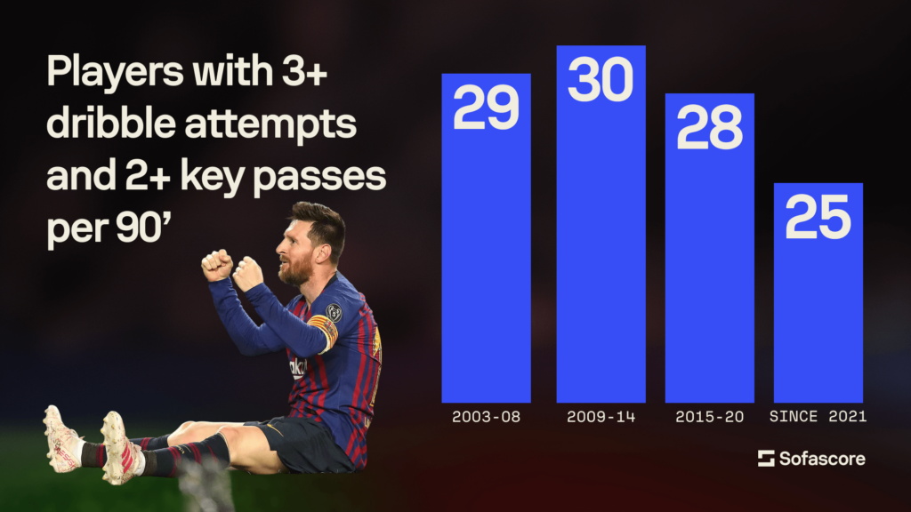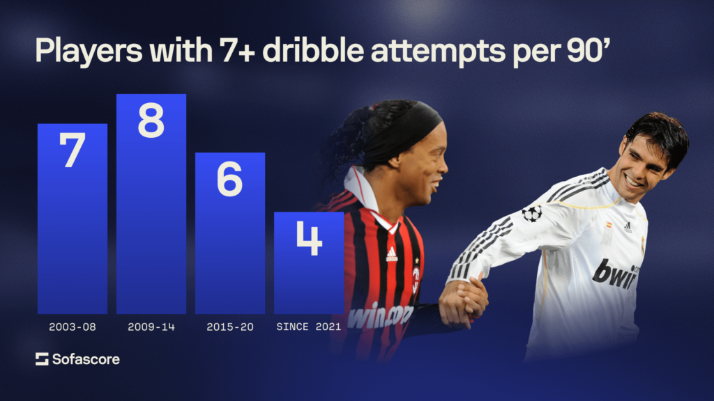 JayDee e Nico si soffermano anche sugli unicorni del calcio odierno. Stiamo parlando di quei pochi che tentano almeno 3 dribbling e forniscono almeno 2 passaggi chiave ogni 90 minuti. In altre parole, la specie in via di estinzione nota come “giocatori che davvero affrontano gli avversari e creano occasioni”, che ricordano giocatori come Luís Figo, Kaká, Juan Román Riquelme, ecc. Il loro numero in calo è più eloquente di qualsiasi editoriale: i grandi intrattenitori del calcio moderno vengono allenati e scomparsi.