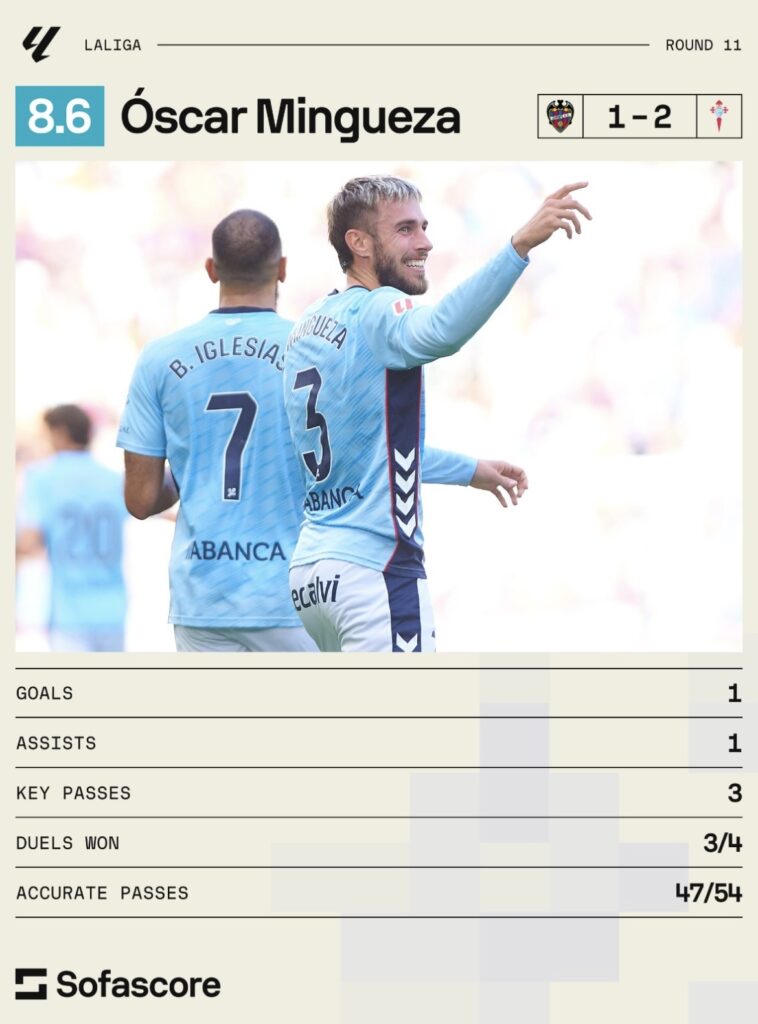 Thiago Almada ha fatto la differenza per l’Atletico, unendo creatività e controllo a centrocampo. Anche Fermin López del Barcellona si è guadagnato elogi per la sua dinamicità nei passaggi e la sua consapevolezza, realizzando direttamente due gol. Anche Oscar Mingueza ha brillato per il Celta, con un gol e un assist che hanno suggellato la vittoria.
