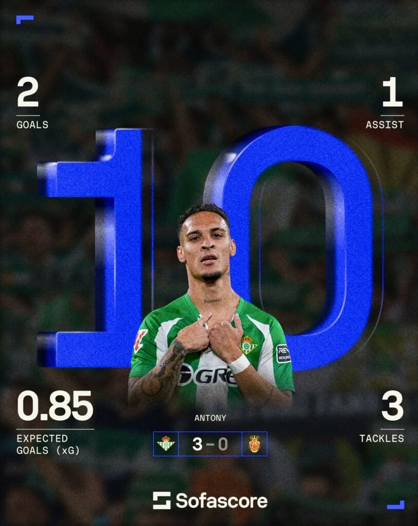 Diverse stelle si sono distinte questa settimana. La prestazione elettrizzante di Antony per il Real Betis è stata la migliore del weekend. I suoi due gol, l’assist e il dominio assoluto sulla fascia destra gli sono valsi un punteggio perfetto di 10 su Sofascore.